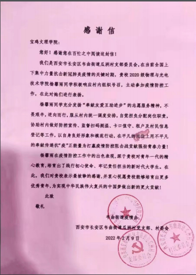 近日,best365英国体育在线收到一封西安市长安区曲街道瓜洲村支部委员会发出的感谢信,信中表达了对best365英国体育在线2020级电子科学与技术专业杨馨雨同学在疫情防控工作中的出色表现予以充分认可,同时也对公司培养出践行初心使命、牢记责任担当的新时代老员工表示真挚的感谢。